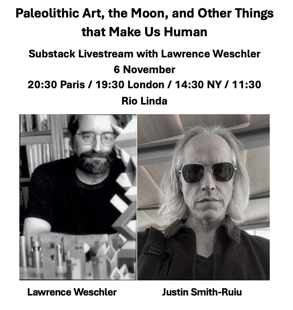 we’re talking about — author of Mr. Wilson’s Cabinet of Wonders (1995), Vermeer in Bosnia (2004), True to Life: Twenty-Five Years of Conversations with David Hockney (2008), And How Are You, Dr. Sacks? A Biographical Memoir of Oliver Sacks (2019), the supremely enigmatic A Trove of Zohars (2023), etc., etc. Weschler is also author of the wonderful Wondercabinet on Substack, to which you should all subscribe. And incidentally he is a great friend and fellow-traveller of The Hinternet.We will be discussing, but not limiting ourselves to, sundry questions related to JSR’s recent essay, “The Moon Makes Us Human”. (Lire en français.) Read it, and join us tomorrow well prepared to throw us a question or two.