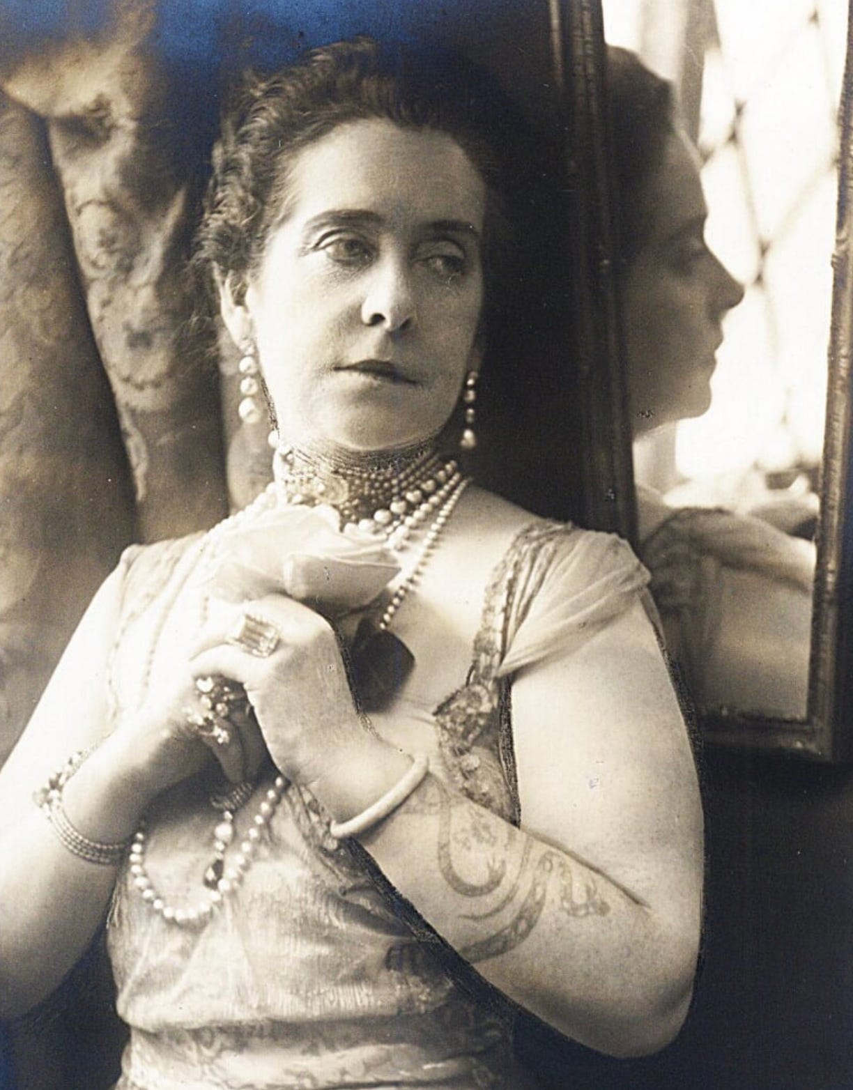But the truly greatest Sacramentan has been celebrated here not at all since her death eighty-two years ago. Aimée Crocker (1864-1941) —or, more properly, Princess Aimée Isabella Crocker Ashe Gillig Gouraud Miskinoff Galitzine— a scioness of the Crocker dynasty, perhaps best known today for founding the splendid Crocker Art Museum, was an adventuress, an advocate for the dignity and self-determination of the Hawai’ian people, a libertine, a snake-handler, a collector of tattoos and amoureux and amoureuses, and, most importantly for my own purposes, a memoirist, who chronicled her life in Europe and in the South Pacific with a blunt style that does not exactly match for idiosyncrasy Didion’s frigid gaze upon the world, but that nonetheless adequately conveys the exceptional qualities of her life and person.