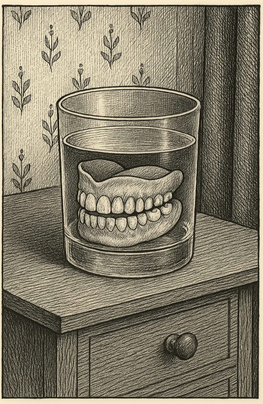 Is it the dentures upon the dresser,
