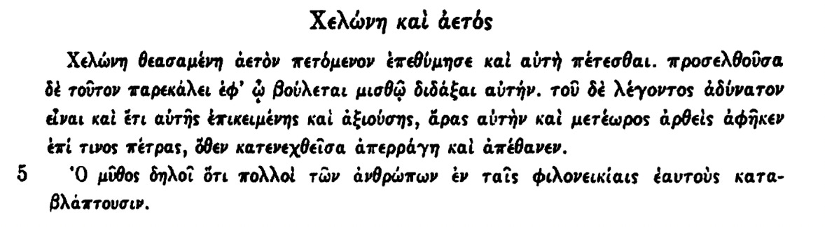 One fable from Aesopic tradition that is less a favourite of mine than something that has burned itself in my memory, like Larkin’s jauntily tetrametric advice about having kids, is indexed 230 in Aesopica: “The Tortoise and the Eagle.” It may be read in several languages on the academic Laura Gibbs’ impressively detailed website, and in early twentieth-century English at Standard Ebooks in a translation by the little-known Cambridge classicist V. S. Vernon Jones. According to the Greek in Perry’s edition, a partial screenshot of a facsimile of which is provided below, the fable shows that “many human beings harm themselves in their rivalries”: